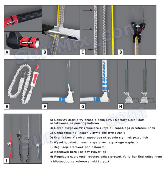 Końcówki Vario Bar End Adjustment umożliwiają regulację szerokości rozstawu linek w zakresie 45-51cm. Bardzo nisko usadzony krętlik Low-V swivel łączący przednie linki i zapobiega ich splątaniu.