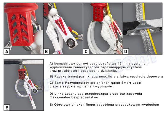 Technologia Naish Smart Loop - system bezpieczeństwa opatentowany przez firmę Naish szybko stał się standardem dla wszystkich innych systemów "push away". 45mm rączka w systemie Smart Loop pozwala na skuteczne wypięcie w każdej sytuacji. Design sytemu pozwala na swobodny przepływ wody przez niego, co upewnia cię w jego niezawodności w każdych warunkach. Takie rozwiązanie pozwala ci się skupić na jeździe i kontroli nad latawcem.