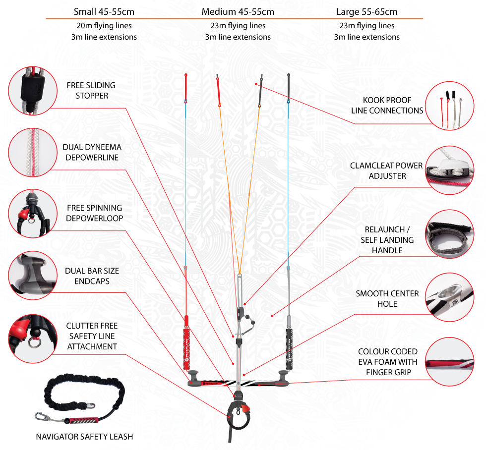 Bar jest dostępny w 3 wersjach, każda oferuje odmienną użyteczność ze względu na szerokość drążka oraz długość linek. Dla riderów chcących używać jednego baru do wielu rozmiarów latawca ten Bar stanowi idealne rozwiązanie. Przedłużki linek oraz 2 opcje mocowania linek na barze (szersza oraz węższa) sprawią, że jednym barem obsłużysz większe oraz mniejsze latawce.