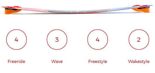- Asymetryczny kształt gwarantuje świetne osiągi w jeździe pod wiatr oraz ostrzenie podczas jazdy „switch”.