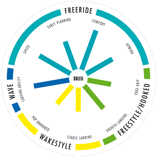 Zaprojektowana przez kobiety z myślą o kobiecej budowie i wadze Soleil posiada także odpowiednio dopasowany rozkład flexu gwarantujący imponującą dawkę POP'a i zwiększający komfort jazdy po wzburzonej wodzie. Ostre krawędzie zapewniają solidny grip i doskonale charakterystyki przy jeździe na wiatr co sprawia że deska świetnie sprawdza się w carvingu i wave