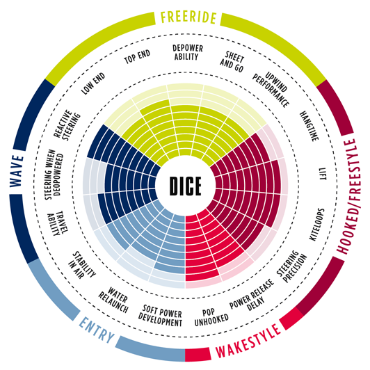 Wakestyle, frestyle, czy waves pływanie z Dice to zawsze doskonała zabawa, jego trzytubowa lekka konstrukcja c-shape nadaje mu niezwykle żywiołowy charakter a jednocześnie sprawia że jest on bardzo przewidywalny i łatwy do opanowania. Dice prowadzi się bardzo intuicyjnie dzięki czemu, początkujący nawet riderzy łatwo się do niego przyzwyczajają. Latawiec ten doskonale sprawdza się na wzburzonej jak i na prawie płaskiej wodzie.