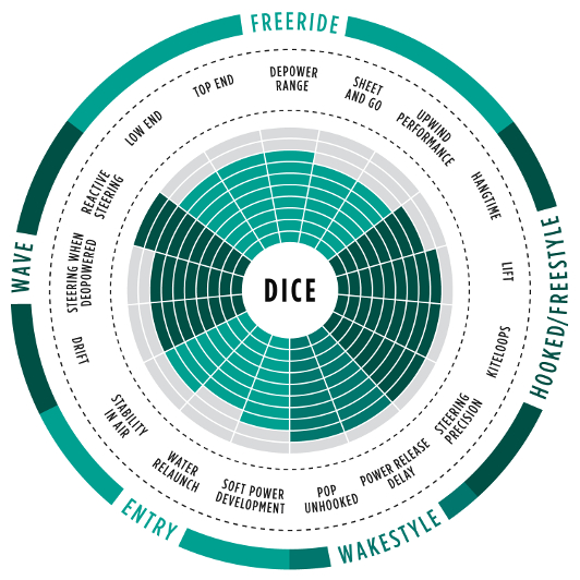 Dice w sezonie 2017 to model o perfekcyjnym balansie między Freestyle oraz Wakestyle. Jego wszechstronność będzie również przydatna podczas pływania na falach. Propozycja szczególnie atrakcyjna dla tych, którym do gustu przypadł model Vegas z poprzednich sezonów. Przemodelowane panele latawca zapewnią znacznie większą wytrzymałość oraz sztywność.