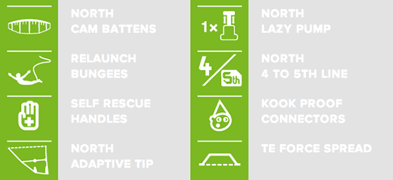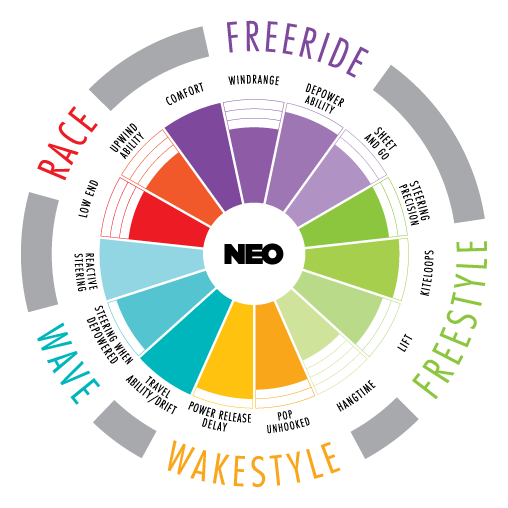 Cechą charakterystyczną tego latawca jest bardzo równomierne rozłożenie mocy na całej długośću łuku zakrętu. Konstrukcja 3 tubowa onznacza drastyczną redukcję wagi dzięki czemu latawiec swobodnie unosi się kiedy jedziesz wzdłuż fali. NEO siedzi nieco z tyłu okna wiatrowego co sprawia że zamiast podlatywać do tyłu unosi się on swobodnie w powietrzu, oznacza to także ze w depowerze zachowana jest bardzo dobra sterowność i latawiec nie traci nic ze swej żywiołowości w górnej części zakresu wiatrowego. Doskonale sprawdza się zarówno przy jeździe hooked jak i unhooked, nadaje się także do freestyle. Łatwy restart i dobry rozkład mocy to cechy które predysponują go do nauki nowych tricków.