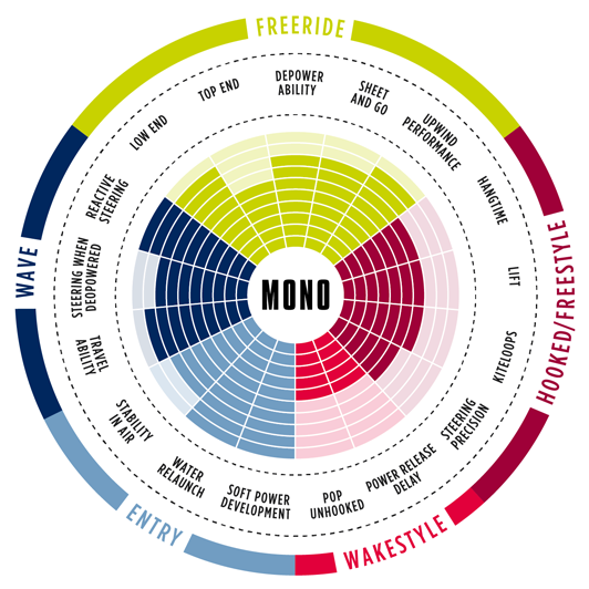 Mono specjalizuje się w lekkim wietrze. Niesamowita wydajność pod względem ostrzenia umożliwia wykorzystać złe warunki panujące na wodzie. Ponadto model ten osiąga świetne rezultaty pod względem low end - w przypadku Mono 5 m2 oraz 7 m2 latawiec dobrze będzie współgrał z deskami surfboard. Mono bardzo dobrze współgra z barem, gwarantując komfort jazdy, nawet przy popełnianiu lekkich błędów. Prędkość skręcania również jest godna pochwały - podobnie jak hangtime oraz łatwość wystartowania z wody w powietrze. Lekka waga przekłada się pozytywnie na możliwość transportu.