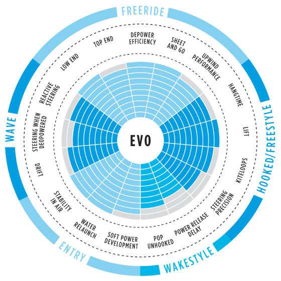 Łatwy system operowania kite’m, sprawny restart latawca, spory hangtime oraz zawrotne osiągi powodują, że staje się on przystępnym latawcem dla każdego, nawet początkującego kitesurfera. Jeśli więc poszukujesz czegoś, co wyniesie Cię na “księżyc”, ogarnie najnowsze freestylowe triki i wrzuci Cię na najlepsze fale, wszechstronny EVO jest kite’m właśnie dla Ciebie.