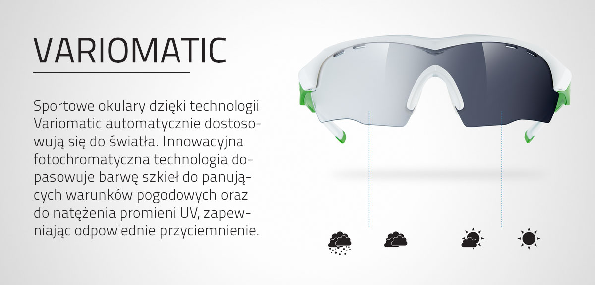 VariomaticSportowe okulary dzięki technologii Variomatic automatycznie dostosowują się do światła. Innowacyjna fotochromatyczna technologia dopasowuje swe odcienie do panujących warunków pogodowych oraz do natężenia promieni UV, zapewniając odpowiednie przyciemnienie. |
